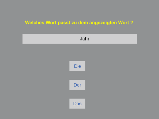 Die Aufgabe des Benutzers besteht darin, den richtigen Artikel auszuwählen. Bei Fehlreaktionen wird der Artikel ausgeblendet. Bei korrekter Reaktion wird der Artikel eingesetzt und grün dargestellt.