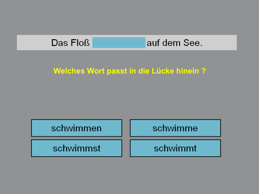 Verbform einsetzen in einen Lückensatz bei Multiple Choice und Ablenkern aus Verbparadigma, Verben und Lückensätze. In der einzelnen Übungsaufgabe wird dem Benutzer in der oberen Bildschirmhälfte ein Lückensatz angezeigt. Die einzusetzende Verbform und die Ablenker werden in der unteren Bildschirmhälfte angeboten. Wählt der Benutzer einen der Ablenker, wird dieser ausgeblendet. Wählt der Benutzer das Zielitem aus, wird der Satz grün hinterlegt und das Programm geht nach 5 Sek. zur nächsten Aufgabe weiter.