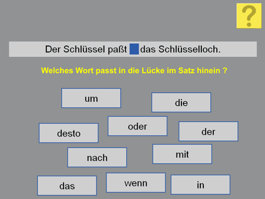 Präposition einsetzen in einen Lückensatz bei Multiple Choice und Ablenkern aus dem Bereich Funktionswörter. In der einzelnen Übungsaufgabe wird dem Benutzer in der oberen Bildschirmhälfte ein Lückensatz angezeigt. Das einzusetzende Funktionswort und die Ablenker werden in der unteren Bildschirmhälfte angeboten. Wählt der Benutzer einen der Ablenker, wird dieser ausgeblendet. Wählt der Benutzer das Zielitem aus, wird der Satz grün hinterlegt und das Programm geht nach 5 Sek. zur nächsten Aufgabe weiter.