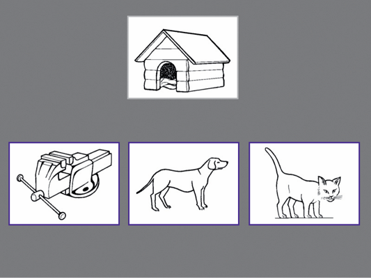 Zuordnung einer Strichzeichnung zur Abbildung eines assoziierten Referenten bei zwei Ablenkern, von denen einer im semantischen Bezug der Kohyponymie zum Zielitem steht, nicht jedoch zum Stimulus.