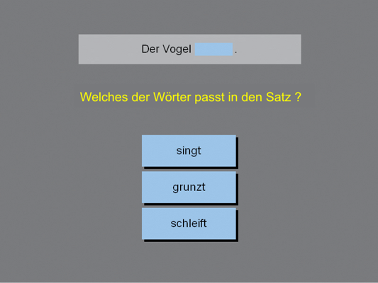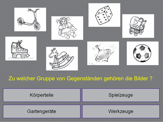 Semantische Merkmalsanalyse einer Gruppe von prototypischen Abbildungen und Bestimmen des zugehörigen Oberbegriffs / Hyperonyms mittels Multiple Choice bei drei Ablenkern.