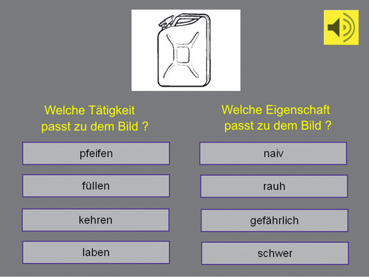 Bestimmen semantischer Merkmale eines abgebildeten Gegenstandes aus einer Liste von Verben und Adjektiven bei jeweils drei Ablenkern.