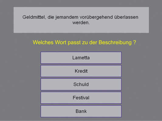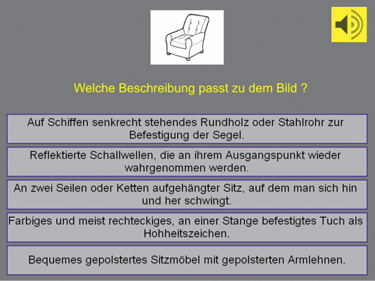 Verstehendes Lesen von Begriffsumschreibungen und Auswahl des Zielitems mittels multiple choice.