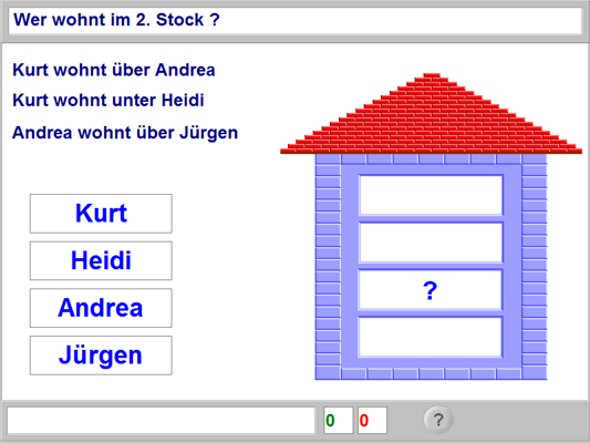 Wenn die drei Aussagen, "A wohnt über/unter B", "D wohnt über/unter C" und "B über/unter über C" aufeinander bezogen werden, kann jedem Bewohner des Hauses eindeutig ein Stockwerk zugewiesen werden.