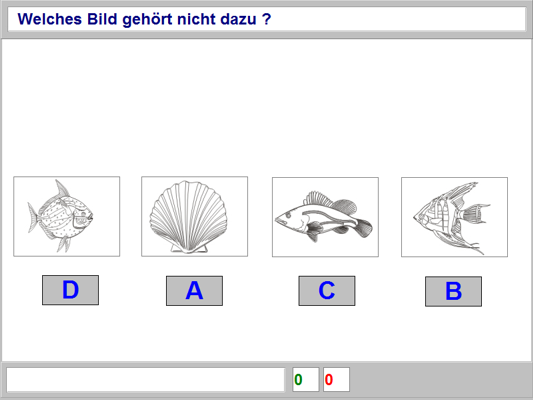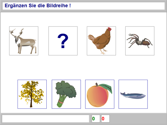Eine Bilderreihe gleichen kategorialen Inhalts wird auf dem Bildschirm dargestellt. Das fehlende Bild soll aus einer Auswahl richtig ergänzt werden.