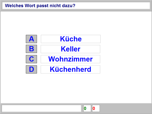 Semantische Differenzierung zwischen verschiedenen logischen Kategorien gleicher Hierarchieebene auf Wortebene (Begrifflich-logische Hierarchisierung). Drei der vier Begriffe gehören semantisch zueinander, ein Begriff passt nicht in diese Reihe. Der nicht zugehörige Begriff soll gefunden werden. Bei dem Aufgabentyp Gemeinsamkeiten Text Kategorien passt ein Begriff nicht in die kategoriale Hierarchieebene der drei anderen begriffe. Der nicht zugehörige Begriff soll gefunden werden.