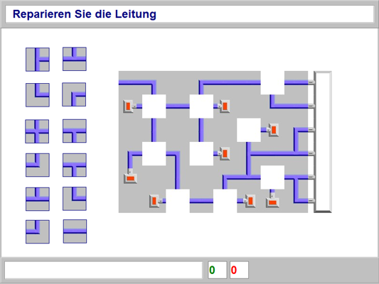 Eine defekte „Platine“, deren Stromfluss Lücken aufweist soll anhand einer Auswahl von Reparaturmitteln wiederhergestellt werden.