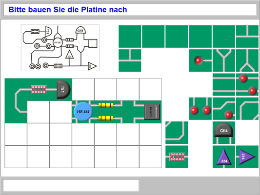 Bei der Aufgabe Schaltplan soll eine Platine anhand eines skizzierten Schaltplans aus einzelnen Bestandteilen aufgebaut werden. Bei dieser Aufgabe ist das Zerlegen des Plans in seine Einzelteile (mentales Segmentieren) relativ einfach, da sich die Bestandteile deutlich voneinander unterscheiden.