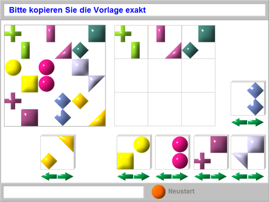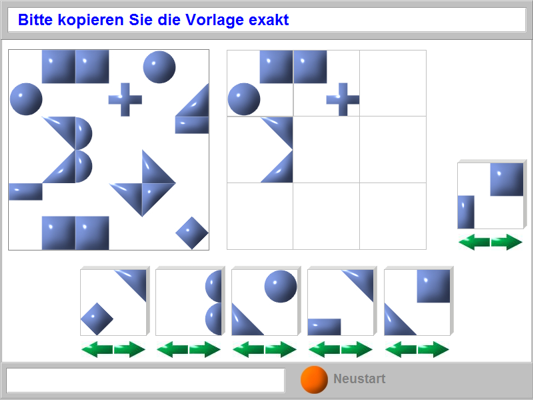 Eine Vorlage soll anhand von 9 einzelnen geometrischen Elementen exakt kopiert werden. Die einzelnen Bestandteile werden zu Beginn nicht in der benötigten Lage angezeigt, sondern müssen (wie bei einem Würfel) durch Drehen in die richtige Position gebracht werden.