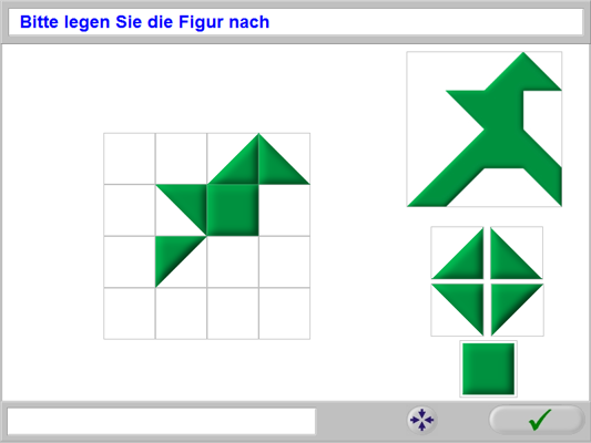 Eine vorgelegte Figur soll aus nur 5 geometrischen Elementen (vier Dreiecken und einem Quadrat) nachgebaut werden.