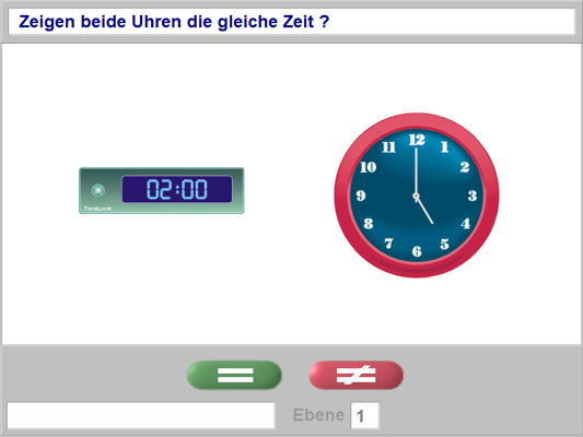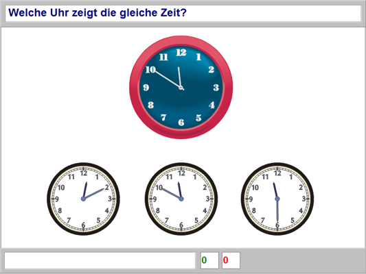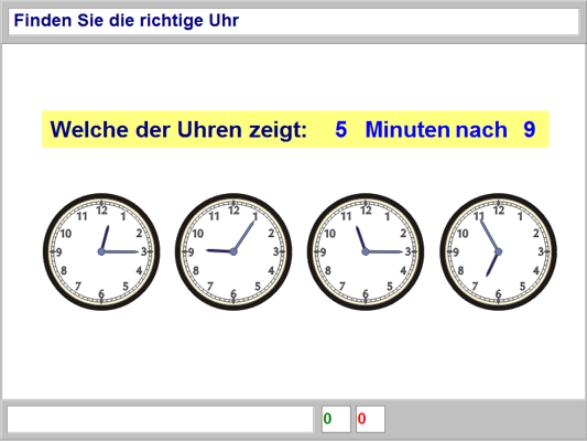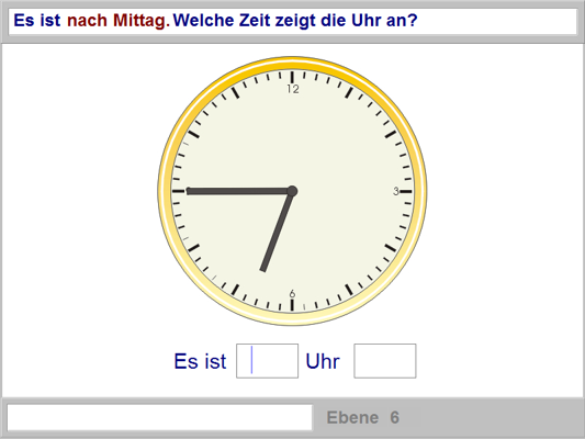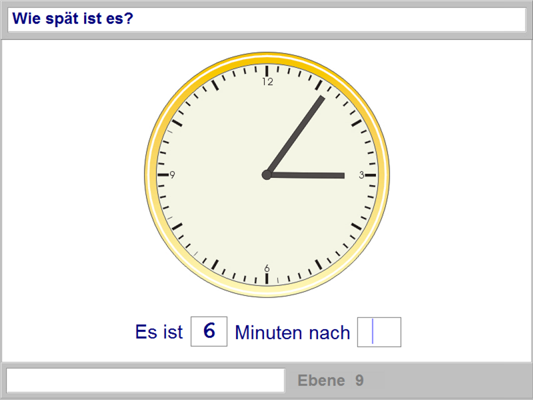 Die auf der Analoguhr angezeigte Zeit soll über die Tastatur angegeben werden. Die Aufgabe enthält 9 Ebenen und beginnt bei der Abfrage voller Stunden. Auf der 9. Ebene wird nach Stunden und Minuten zugleich gefragt. Die Abfragen richten sich nach dem Sprachgebrauch (x Minuten vor/nach halb, viertel vor/nach etc.).