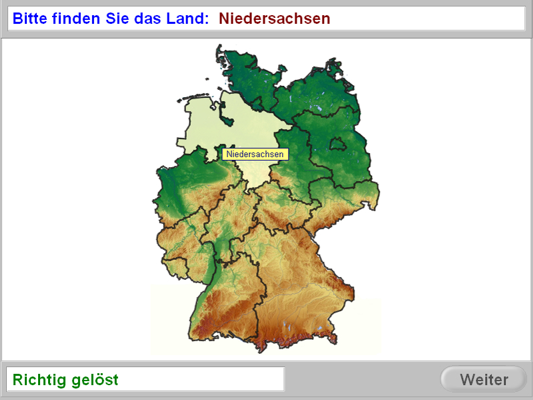 Bei jedem Aufgabendurchgang wird nach einem Bundesland gefragt, das auf der Karte gefunden werden soll.