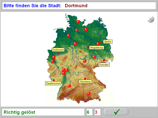 Bei jedem Aufgabendurchgang wird nach einer Stadt gefragt. Es soll angeben werden, an welchem Ort auf der Karte sich die Stadt befindet.