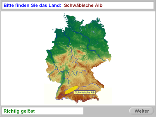 Das Modul Geografie enthält 11 Aufgabentypen für die Reaktivierung bzw. Auffrischung des Basiswissens im Bereich Erdkunde. Die Themen sind beim Ausgangspunkt Deutschland speziell (Bundesländer, Städte, Gebirge) und werden bei der Europäischen Union, den Mittelmeerländern und den Nahen Osten allgemeiner (Lage des Landes auf der Karte, Hauptstädte).