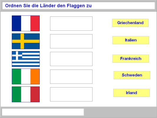 In jedem Aufgabendurchgang werden fünf Fahnen und fünf Länder der Europäischen Union angezeigt.