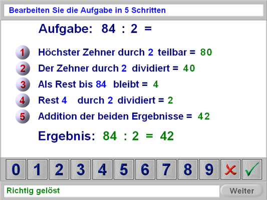 In 5 Schritten wird die Division größerer Zahlen geübt.