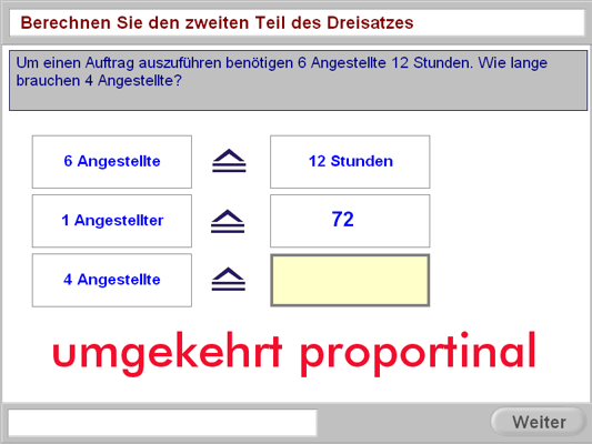 Es wir der Umgang mit Dreisatzaufgaben geübt. Dabei werden sowohl Aufgaben mit proportionalem Verhältnis als auch Aufgaben mit umgekehrt proportionalem Verhältnis gestellt.