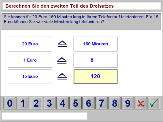 Nachdem die einzelnen Elemente eines Dreisatzes richtig in einer Tabelle angeordnet worden sind, werden die Aufgaben nach einem Schema